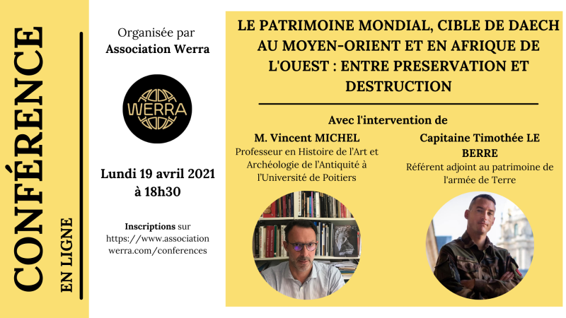 L'Association Werra est heureuse de vous présenter sa nouvelle conférence qui aura lieu le lundi 19 avril 2021 à 18h30. A cette occasion, nous recevrons deux spécialistes : Monsieur Vincent MICHEL, Professeur en histoire de l’art et archéologie antique et travaillant sur la lutte contre le trafic des biens culturels dans les pays en conflits, et le capitaine Timothée Le BERRE, adjoint au référent patrimoine de l’armée de Terre (DELPAT) ayant notamment été déployé lors de l’opération Barkhane. Ils nous présenteront la problématique de la destruction du patrimoine par le groupe terroriste Daech ainsi que les moyens mis en œuvre pour préserver ce patrimoine.