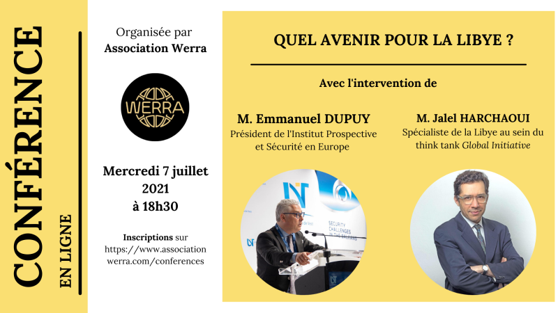 Werra a le plaisir de vous présenter sa nouvelle conférence sur l'avenir de la Libye, qui se déroulera le mercredi 7 juillet 2021 à 18h30. A cette occasion, nous recevrons Monsieur Emmanuel DUPUY, Président de l'Institut Prospective et Sécurité en Europe, et Monsieur Jalel HARCHAOUI, spécialiste de la Libye et chercheur au think tank Global Initiative.
